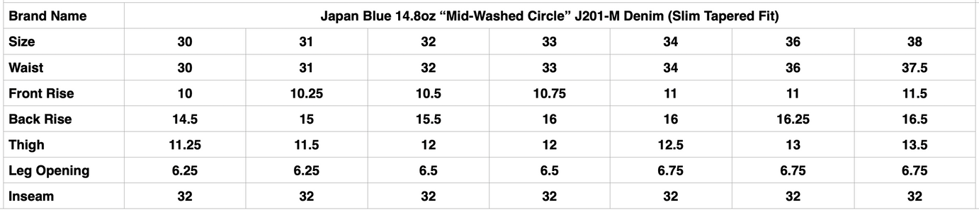 Japan Blue 14.8oz “Mid-Washed Circle” J201-M Denim (Slim Tapered fit)