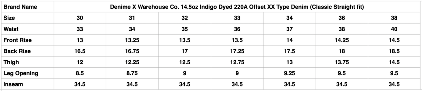 Denime X Warehouse Co. 14.5oz Indigo Dyed 220A Offset XX Type Denim (Classic Straight fit)