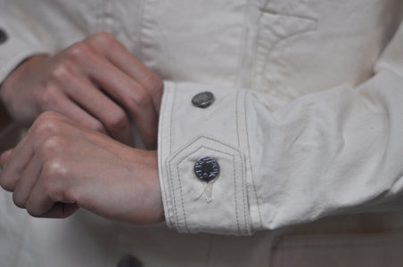 Speaking of construction, this jacket features triple-needle stitching throughout for enhanced durability and structure, while the olive thread adds some tasteful contrast against the raw white colourway! The front placket features large hand-polished iron "Ironalls" branded buttons - a tribute to a real American workwear company in the early 20th century! These buttons are detachable, a nod to railworkers in the early 20th century who would replace them with their branded railway company buttons. The sleeves feature adjustable openings to get the perfect fit. The cinch collar can be worn three ways - open, fastened across, or buttoned back, depending on your preference. The chest pockets feature an asymmetrical design for an authentic vintage style, while the waist pockets are perfect for storage or hand warmer pockets! This jacket also features one internal pocket to store your valuables!