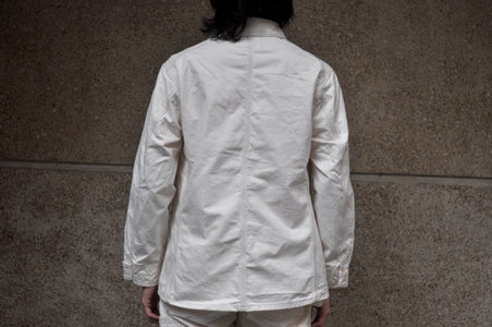 This jacket is constructed with 11oz high-density cotton drill fabric, specially developed by Freewheelers. Slowly woven on vintage shuttle looms, this fabric has a smooth yet subtly irregular texture that is extremely comfortable against the skin. The raw white colourway comes from the beauty of the unbleached and undyed cotton yarns. With time, this fabric will turn whiter and age with a soulful patina, just like those vintage coveralls worn by workers of the past!