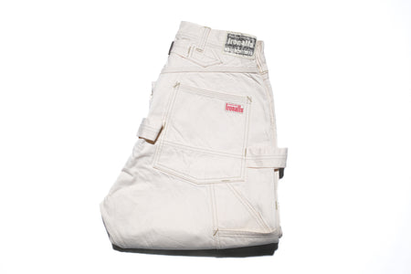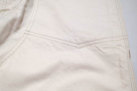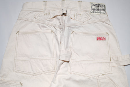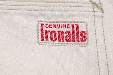 Speaking of construction, these pants feature triple-needle stitching throughout for enhanced durability and structure, while the olive thread adds some tasteful contrast against the raw white colourway! The front thigh-to-hem section and rear pockets feature double-fabric construction for enhanced durability! With hammer loops on the rear and sides, a one-piece fly, a branded "Ironalls" patch on the rear, and multiple tool pockets for storage, these overalls are loaded with vintage workwear charm. The top fly button features a large hand-polished iron "Ironalls" branded button - a tribute to a real American workwear company in the early 20th century!