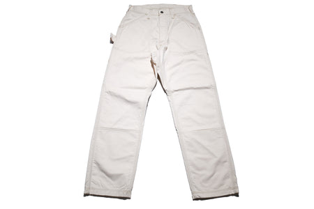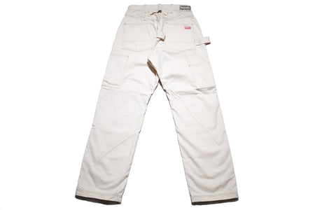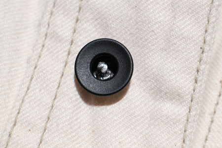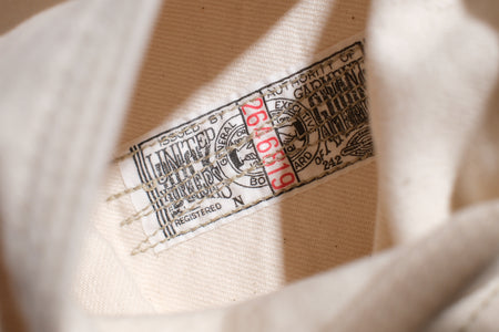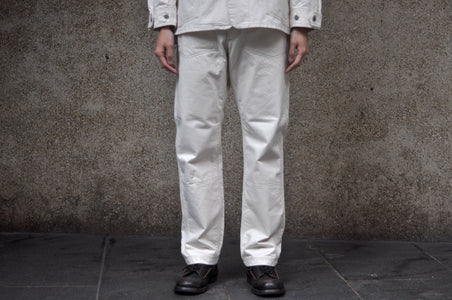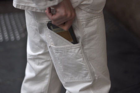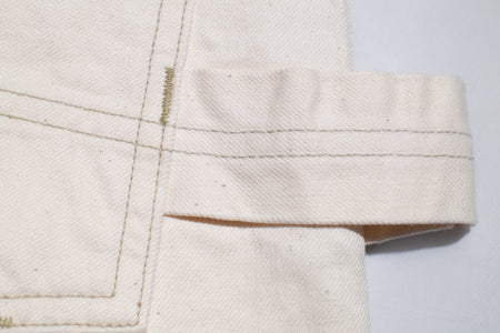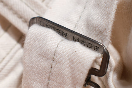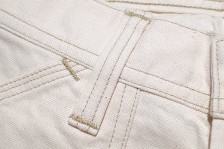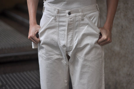 These work pants are constructed with 11oz high-density cotton drill fabric, specially developed by Freewheelers. Slowly woven on vintage shuttle looms, this fabric has a smooth yet subtly irregular texture that is extremely comfortable against the skin. The raw white colourway comes from the beauty of the unbleached and undyed cotton yarns. With time, this fabric will turn whiter and age with a soulful patina, just like those vintage coveralls worn by workers of the past!