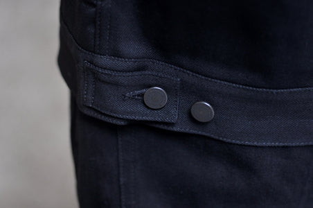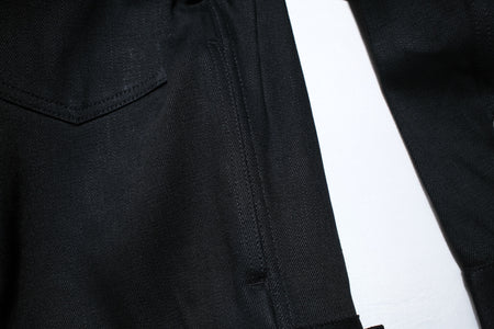Constructed with Momotaro’s specially developed 14.7oz peach colour selvage ID ‘Solid Black’ denim, to create this 14.7oz peach colour selvage denim, Momotaro chose the standard long-fibre Zimbabwe cotton for the warp (exterior) and extra-long-fibre hand-picked Zimbabwe cotton for the weft (interior), then slowly and tightly woven from the vintage denim machine. This results in the denim having a smooth touch and some uneven textures underneath. The interior is silky-smooth after a soak or wash, which you will love to wear daily. Both weft and warp are sulphur thread-dyed in a solid black tone, with wear and wash, this denim will age to a high-contrast, ‘Black and White’ look!