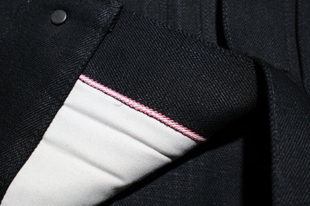 • Japanese 14.7oz peach colour selvage ID "Solid Black" denim