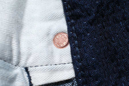 This pair of trousers is constructed with Omoto Denim’s specially developed 15oz sashiko knitting fabric, which is slowly woven on a vintage machine at an ultra-slow pace, giving this fabric a unique, uneven hand feel. The warp cotton yarns are thread-dyed in grand indigo. With wear and wash, they will age nicely to a high-contrast look, just like their raw denim.
