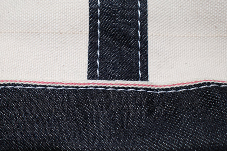 This large tote bag is constructed with two different fabrics. The major body is constructed with Japanese heavyweight duck canvas, which is made of unbleached cotton; the straps and bottom lining are made of 12oz red selvage ID denim. Slowly woven on vintage denim machines, this 12oz denim features a subtle, uneven textured surface with a smooth touch. The grand indigo is thread-dyed, and with time, it will age nicely to a high-contrasted look!