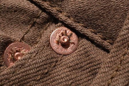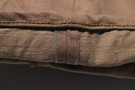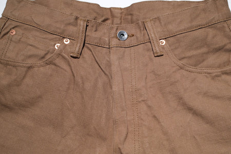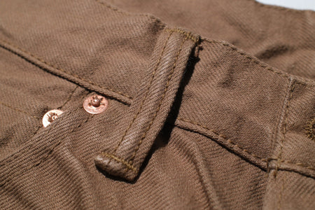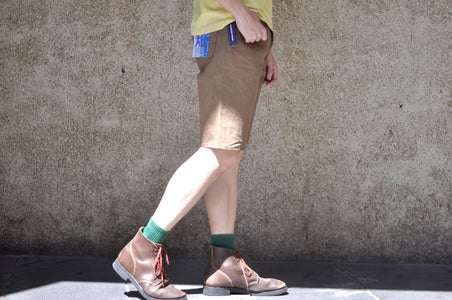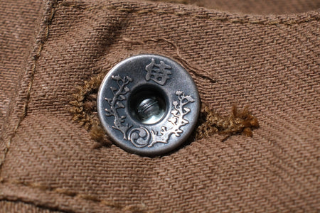 These shorts are constructed with a 100% cotton silver lamé selvage I.D, 15oz selvage duck canvas fabric, which is specially developed by Samurai and slowly woven on vintage machines at the limit of their capacity. This process results in a hardy, substantial material with a slubby texture. The dark khaki colour is sulphur yarn-dyed, and will age with time to a high-contrasted look like their indigo dyed denim!