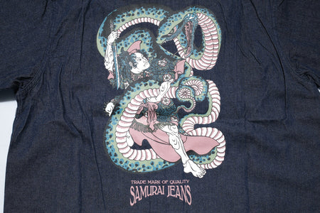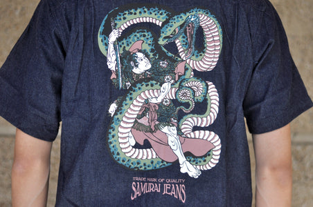 This denim open-collar shirt from Samurai features a striking graphic design inspired by traditional Japanese ukiyo-e paintings from the Edo period, which depicted scenes of legendary warriors and historical battles. This shirt features the mythical warrior Wada Tanenaga battling a giant serpent in the cave of a mountain. Samurai has resurrected this legendary tale in style to commemorate the Year of the Snake!