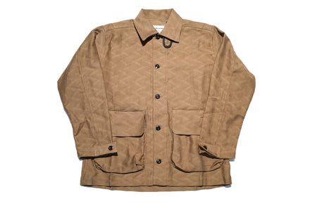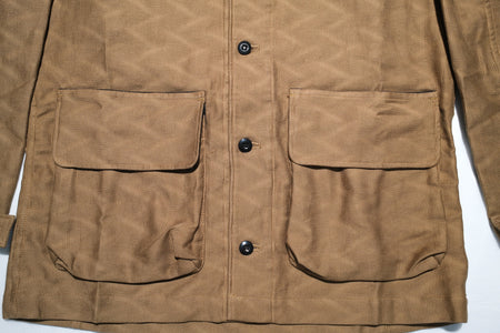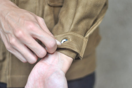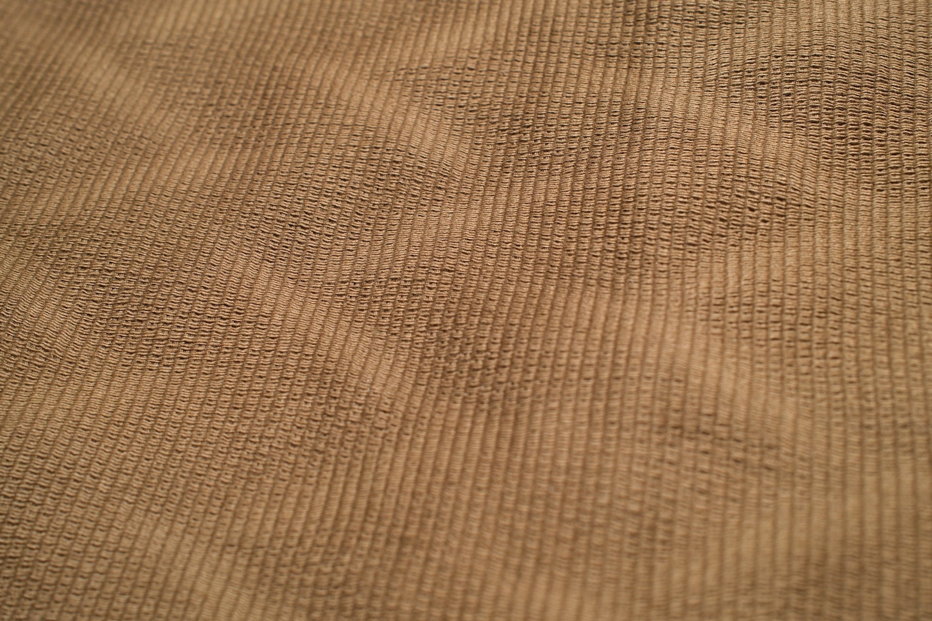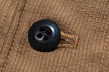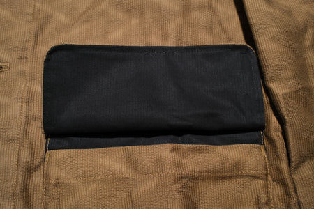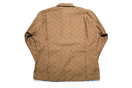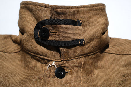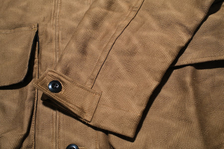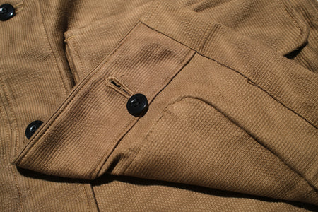 This jacket is crafted from Samurai’s specially developed medium-weight jacquard knit fabric, inspired by high-density Bedford Cord and slowly woven on a vintage jacquard knitting machine. The fabric features a strong vertical rib texture reminiscent of the original Bedford Cord, while a subtle wavy woven pattern evokes the movement of the ocean. The khaki color is achieved through thread dyeing and will develop rich contrast and character with wear and washing.