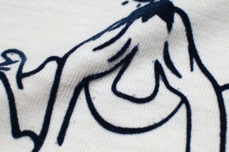 The specially developed fabric has strong horizontal textures that resemble the segments on a bamboo stalk. Thanks to the slow weaving process on vintage machines, the fabric has an elastic, comfortable texture while remaining highly breathable for everyday wear! Each knitting machine has to work at a very slow pace and can only produce enough fabric for 10 T-shirts per day! The design is skillfully screen printed to create a soulful "New Vintage" look, which will only get better with age as it crackles and fades!