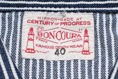 This jacket utilises BONCOURA’s specially developed 14oz selvage hickory fabric. Slowly woven using reconstructed vintage denim machines, this fabric has a soft feel with subtly irregular texture. The dark navy hickory stripes are made with yarns thread dyed with pure indigo. With wear and washing, you can expect this fabric to age to a high-contrast, beautiful, bright sky-blue look!
