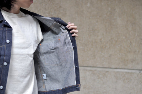 This jacket is crafted from Japanese 14.5oz white selvage XX denim specially developed by Kurabo Mills and Denime. The fabric uses long-fibre, light-brown American cotton blended with dark-brown tea cotton, and is slowly woven on vintage shuttle looms. The result is a denim that is silky-smooth to the touch with subtle uneven textures. The cotton is thread-dyed with pure indigo. With wear and washing, this jacket will gradually reveal bright indigo hues, ageing into a beautifully high-contrast look.