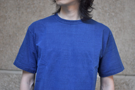 This indigo dyeing process is truly fascinating. The cotton thread is first dyed with grand indigo, and afterward, Japanese craftsmen apply a traditional natural indigo hand-dyeing technique to the finished garment. This double-dyeing method gives the indigo T-shirt a deeper, more soulful character. As you wear and wash it, the fabric will gradually develop a high-contrast fade with a rich, soulful patina.