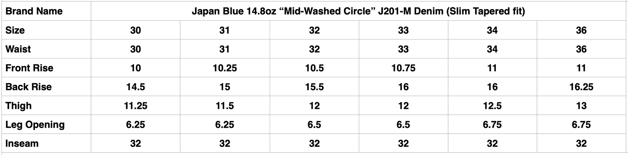Japan Blue 14.8oz “Mid-Washed Circle” J201-M Denim (Slim Tapered fit)