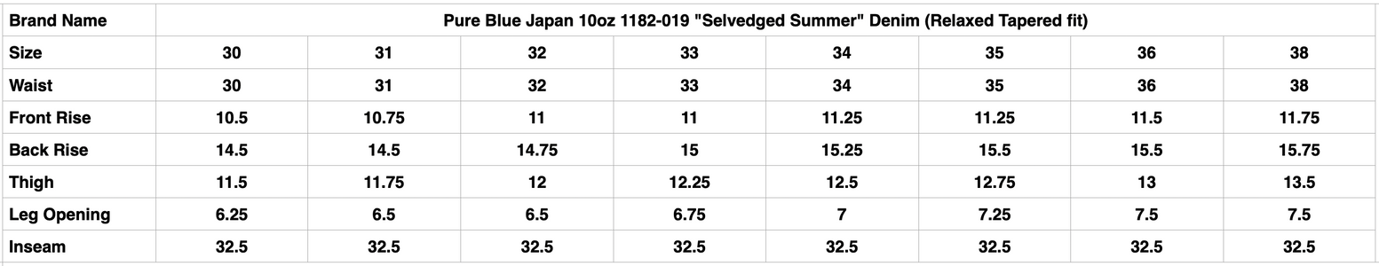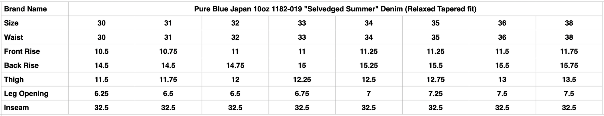 Pure Blue Japan 10oz 1182-019 "Selvedged Summer" Denim (Relaxed Tapered fit)