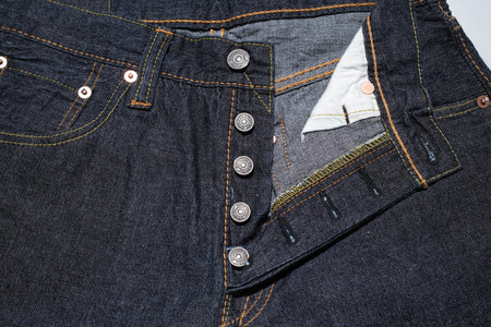 This pair is constructed with PBJ’s specially developed 10oz red selvedge I.D. denim. This denim has been slowly woven using vintage denim machines, resulting in a mild uneven texture and ultra-comfortable hand-feel. The warp is thread-dyed with grand indigo, and the weft is sulphur thread-dyed with light grey, with wear and wash, this denim will age nicely to a high-contrasted look!