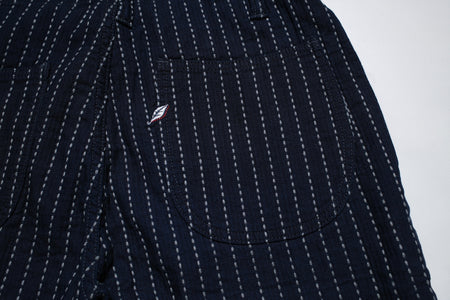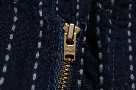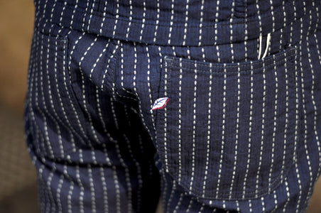 Constructed with PBJ’s specially developed 12oz “Wabash Type” sashiko, which is slowly woven from the vintage jacquard machine. This results in a smooth touch and uneven dotty textures. The grand indigo is thread-dyed, and with wear and wash, it will age nicely to a high-contrasted look, just as their raw denim!