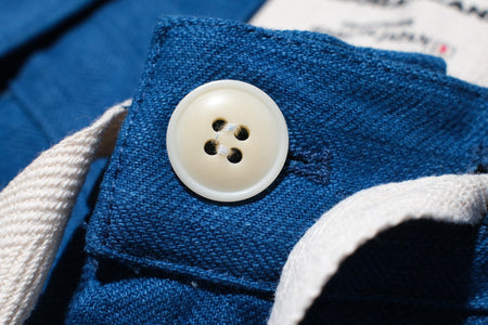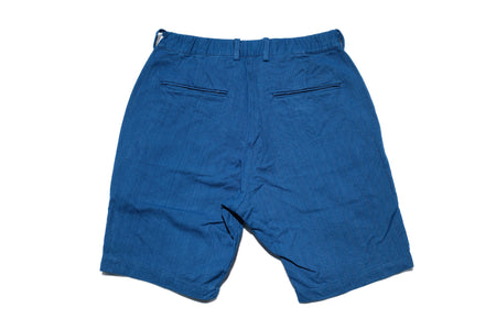 This exceptional pair of shorts is constructed with medium weight herringbone twill, specially developed by Samurai. Slowly woven using vintage machines, this fabric has an incredible three-dimensional texture while being soft and comfortable against the skin. This fabric is yarn-dyed by hand using natural indigo to create this beautiful ocean-blue colourway. With wear and wash, this short will appear in many shades of indigo with the HBT pattern becoming more enhanced!