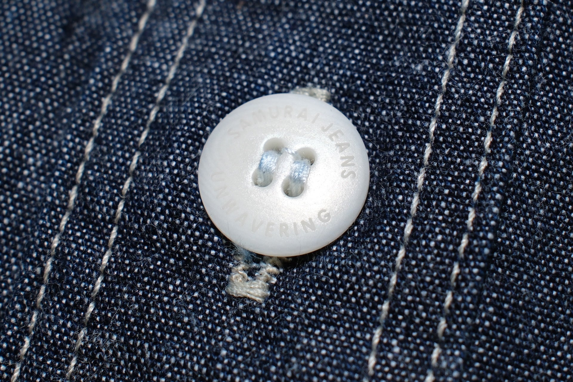 This shirt is constructed with 13oz white selvage ID high-density denim, which is specially developed by Samurai! This 13oz white selvage ID denim is slowly woven on the vintage denim machine, which comes with ultra-strong vertical texture. The genuine indigo is thread-dyed, and with time, it will age nicely to a more vintage look with stronger vertical textured fades!