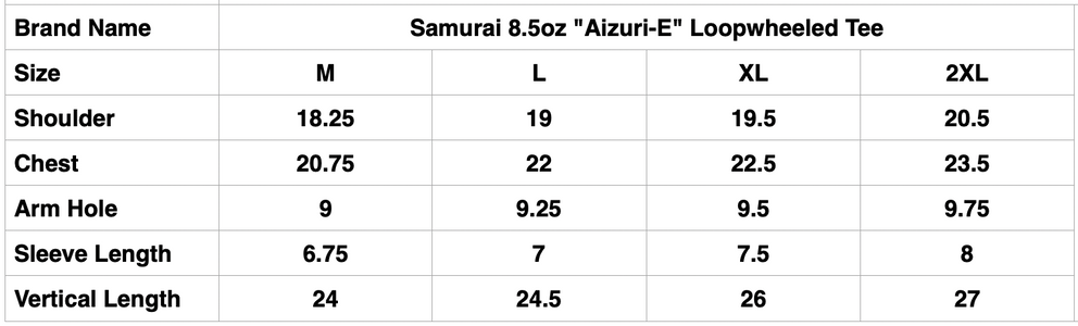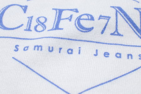 This tee is constructed with Samurai's signature heavyweight 8.5oz loopwheel fabric. Slowly woven using vintage machines, this fabric has a substantial, super-soft feel with a mildly irregular texture! Samurai’s printing technique is super skilful! If you look closely, you can see the crisp level of detail and lettering that features varying levels of tone that will develop a gorgeous marbled look with wear.