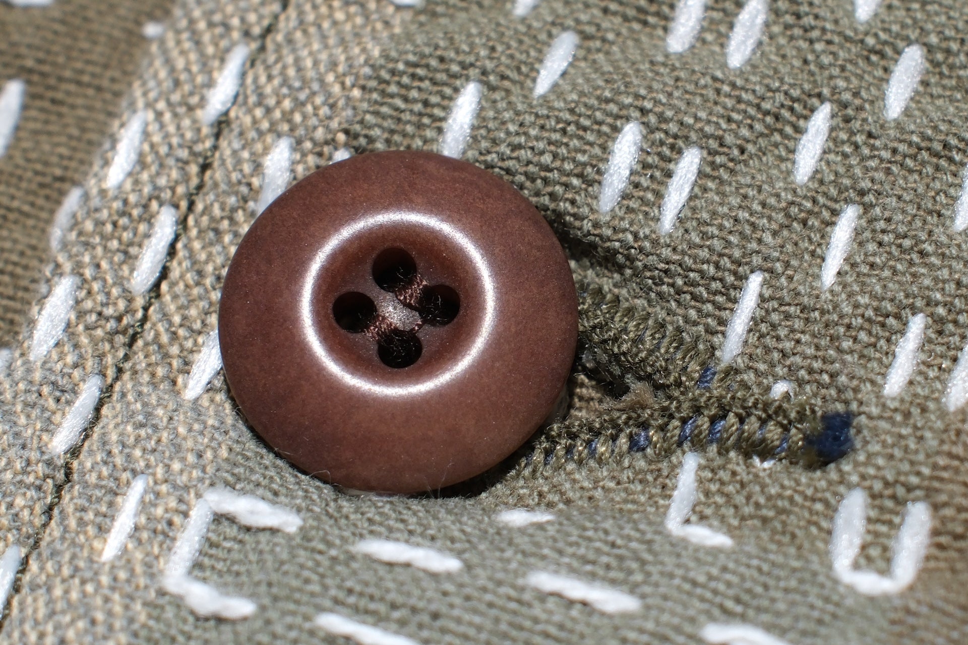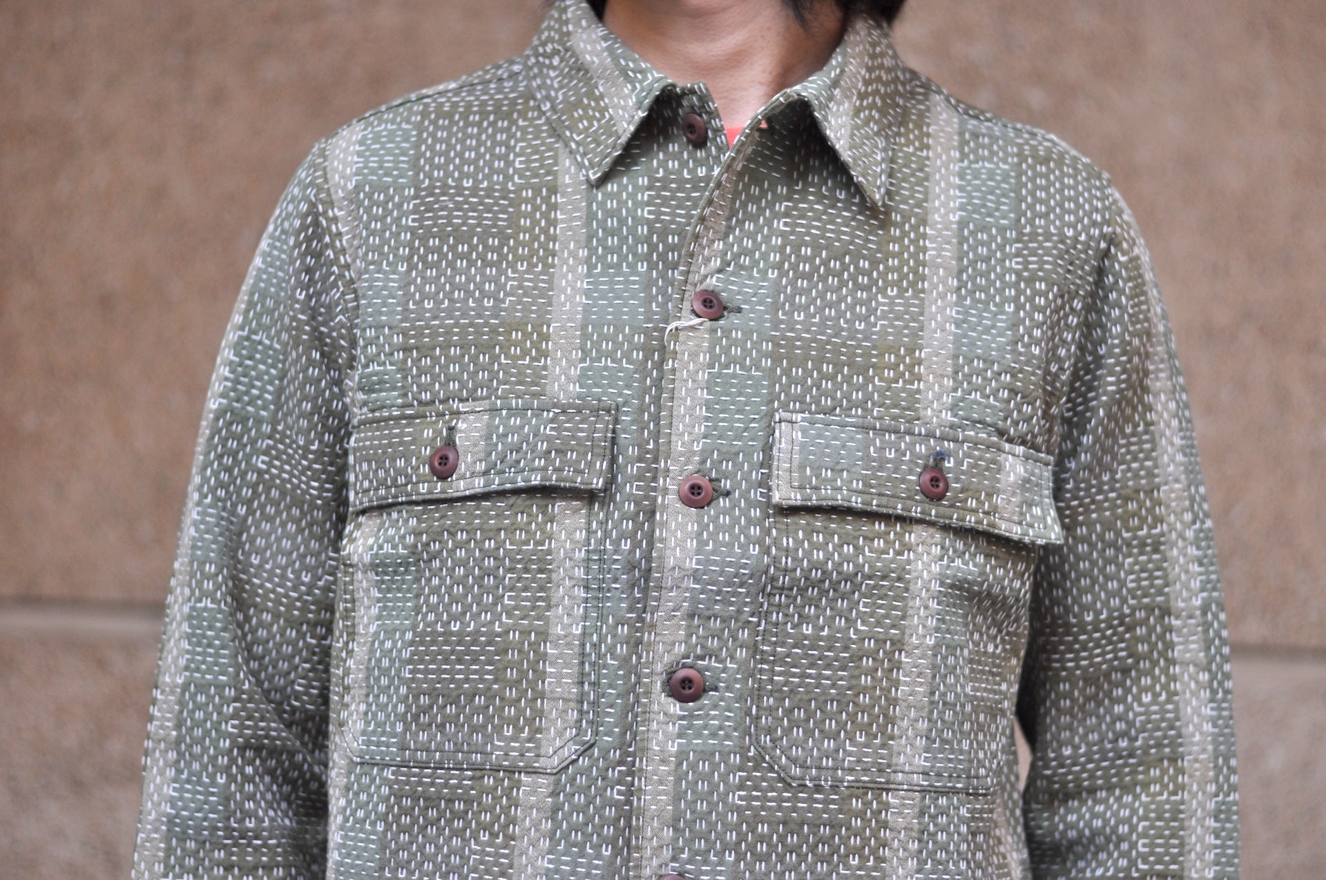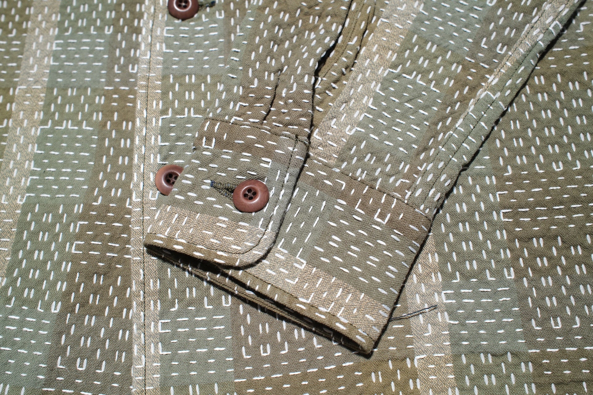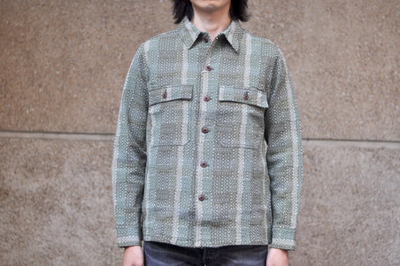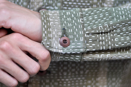 Thanks to the heavyweight sashiko, you can easily wear this one as an overshirt in the warm season! For some tasteful contrast against the fading sashiko, the natural Tagua buttons have been added, and some beautiful sheen will appear with time!