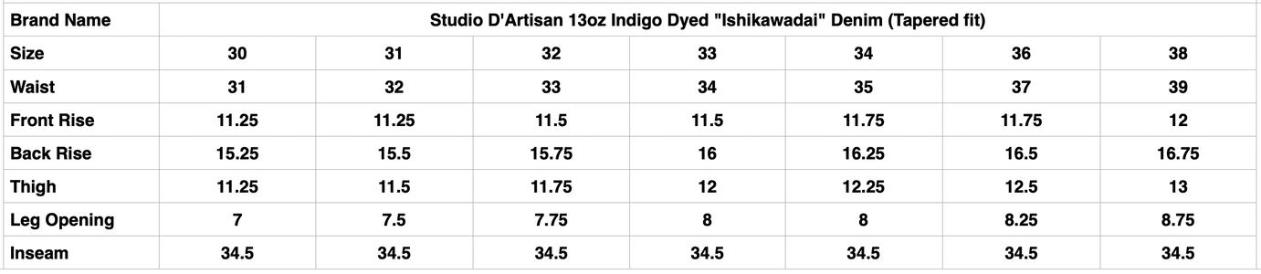Studio D'Artisan 13oz Indigo Dyed "Ishikawadai" Denim (Tapered fit)