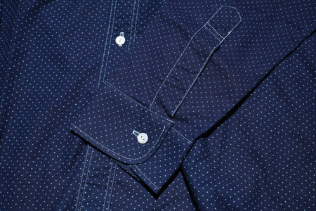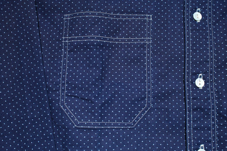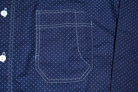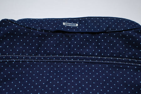 This shirt is crafted from Warehouse Co.’s specially developed 5oz selvage Wabash, slowly woven on a reconstructed denim loom, giving it a silky-smooth hand feel. Unlike typical discharge prints, the white dots are resist-dyed, resulting in subtle irregularities that add depth and soul to the fabric. The genuine indigo is thread-dyed, ensuring the shirt will gracefully fade with wear and washing, developing a rich, vintage contrast over time.