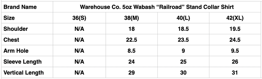 Warehouse Co. 5oz Indigo Dyed Selvage Wabash "Railroad" Stand Collar Shirt